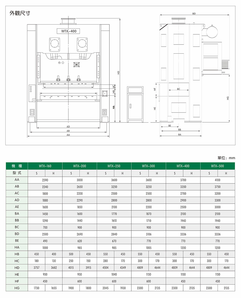 WTX系列沖床機身具有極高之剛性、良好之精度及較大之床面,可適用連續(xù)加工順?biāo)椭铝稀_孔、成形、引伸等加工,并可選擇性加裝移動臺車,以達快速換模之目的。此種機型特別適用于汽車、摩托車、五金、家電等制品之沖壓加工。